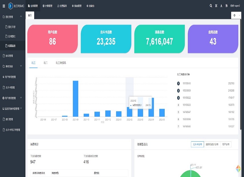 基于我国北斗三号卫星导航系统RDSS服务能力,实现短报文通信、位置监控、电子围栏、北斗卡管理、用户管理等功能,具备收费、计费等运营管理能力,为林业、海洋、交通、气象、应急、通航等行业提供短报文通信服务,满足相关行业系统快速集成北斗服务的需求。